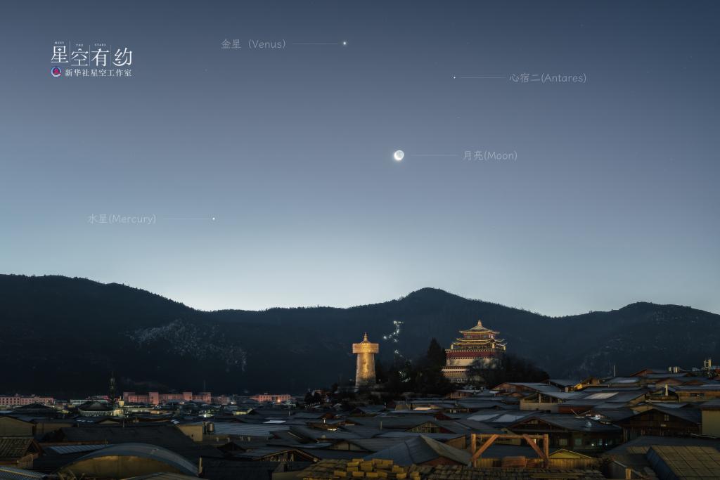 云南星空攝影愛好者張茂海2023年1月9日在云南迪慶拍制的金星、心宿二伴月。(本人供圖)