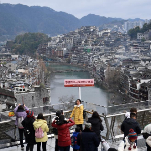 2月1日,游客在湖南省鳳凰磁浮觀光快線鳳凰攬勝站外的觀光步道游覽。 新華社記者 陳振海 攝