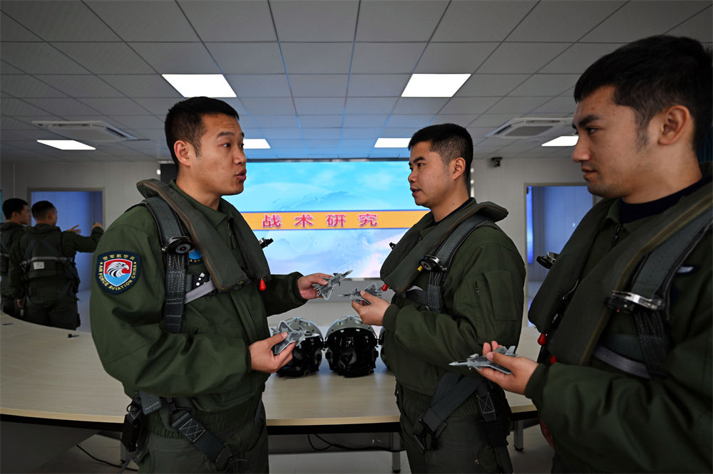 空軍航空兵某旅飛行一大隊飛行員完成空中對抗后,到戰術研究室展開復盤(2023年12月19日攝)。新華社發(余紅春 攝)