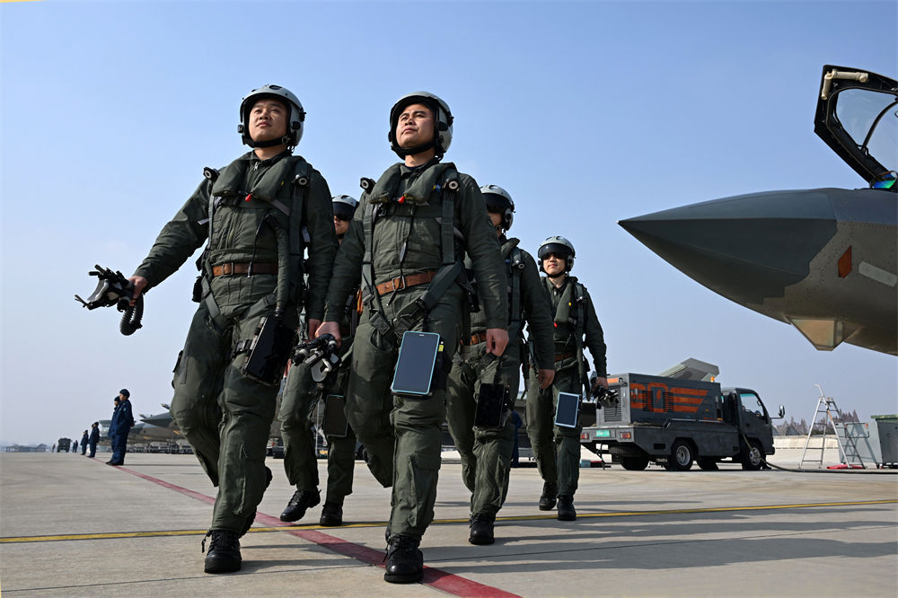空軍航空兵某旅飛行一大隊飛行員完成準備走向訓練場(2023年12月20日攝)。新華社發(余紅春 攝)