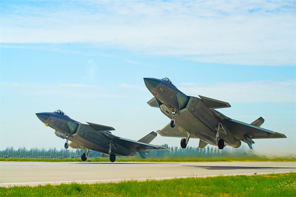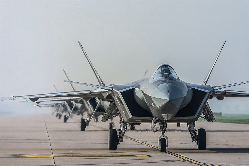 空軍航空兵某旅飛行一大隊飛行員駕駛殲-20戰機編隊起飛(2022年7月17日攝)。新華社發(王鴻飛 攝)