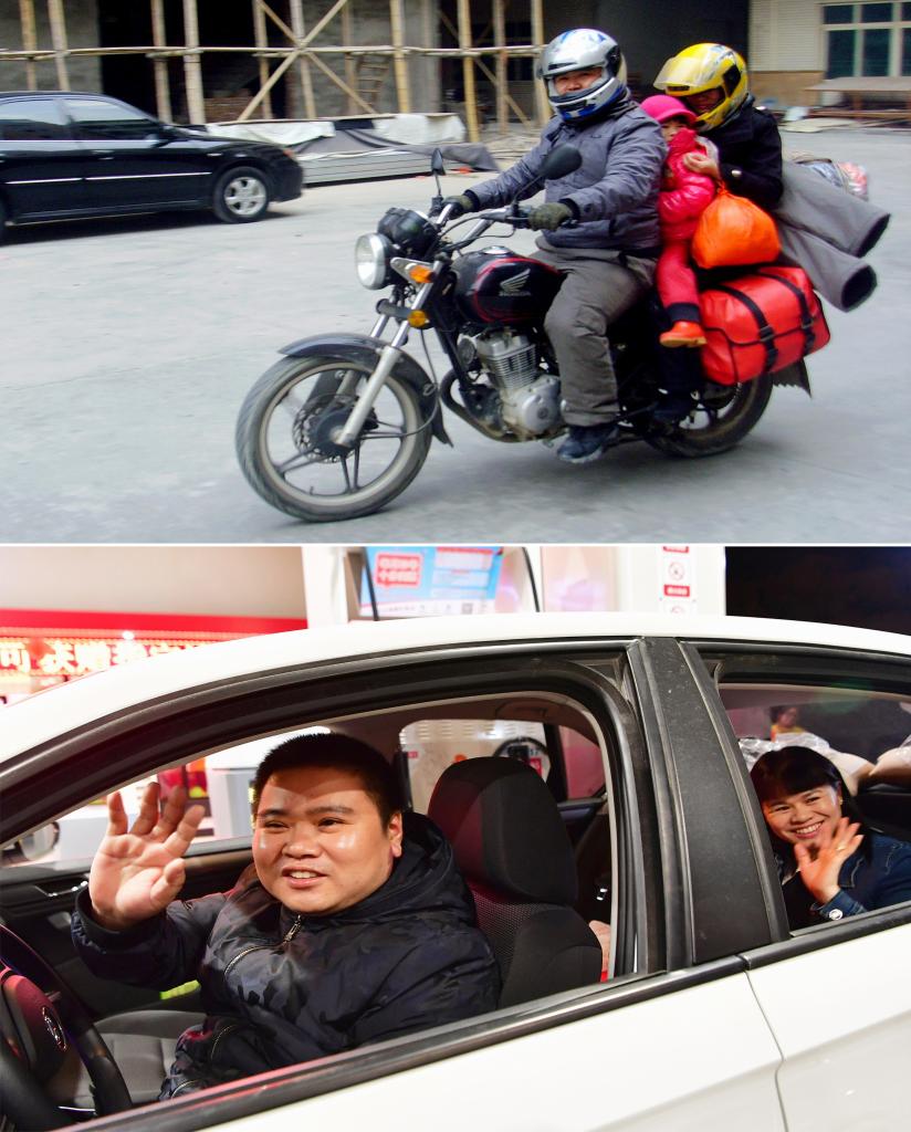 拼版照片:上圖為2013年2月2日,在福建務工的董日旭帶著家人騎摩托車返回江西老家過年(新華社發);下圖為2020年1月15日,董日旭開著他新買的汽車,準備和家人開車返鄉過年(新華社記者魏培全攝)。
