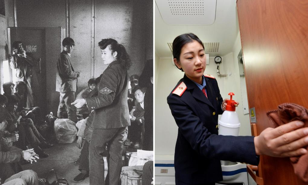拼版照片:左圖為1994年春運期間,在濟南鐵路局“棚代客”列車上,乘務員在向乘客講解臨時搭建的簡易廁所使用注意事項(新華社發);右圖為2017年1月12日,在蘭州鐵路局銀川客運段增開的銀川發往北京的臨時旅客列車上,乘務人員在清潔車上的衛生間(新華社記者彭昭之攝)。