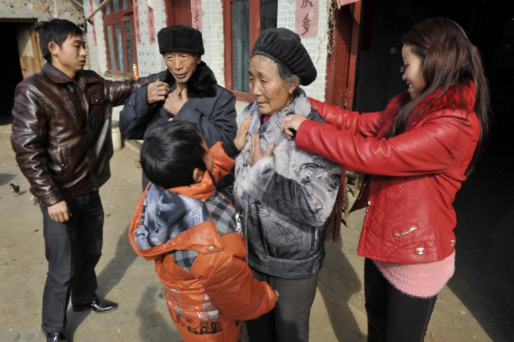 2013年春運期間,貴州黔西南州安龍縣平樂鄉朗元村外出打工的陳順付回到家中,這是1月29日陳順付和妻子一起幫老人試穿新裝。新華社記者 歐東衢 攝