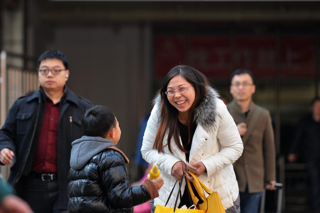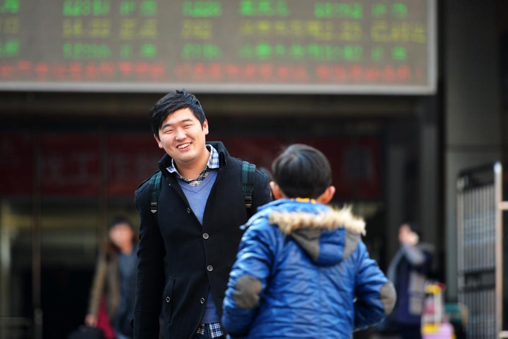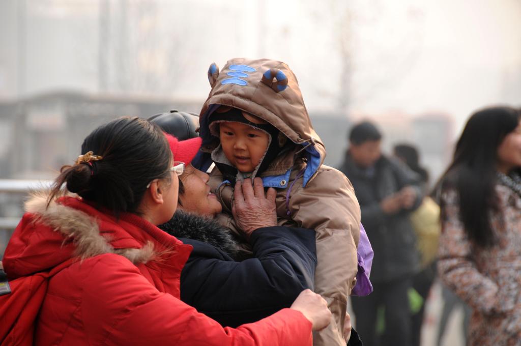 2015年2月18日,在蘭州火車站,一名到達旅客見到孩子后露出笑容。新華社記者 陳斌 攝