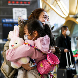 2023年1月15日,曹紫嫣小朋友抱著兔子玩偶在昆明市長水機場迎接媽媽。新華社記者 江文耀 攝