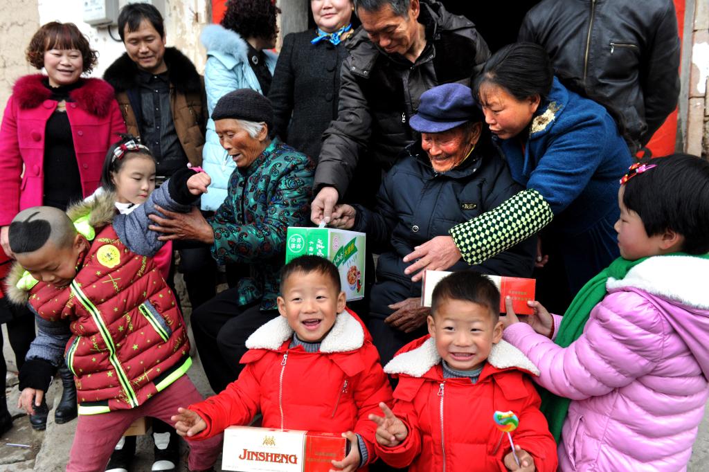 2015年2月17日,晚輩們回家團聚讓浙江省武義縣新宅鎮安鳳村朱功其(二排右二)和戴金球(二排右三)老夫妻倍感溫馨。新華社發(張建成 攝)