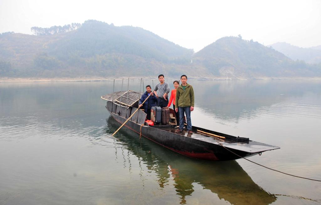 2014年1月28日,李家仁(右一)、李家才(左二)及妻子回到鎮上后,父親用船接他們回家(拼版照片,1月28日攝)。家住在廣西柳江里雍鄉長沙村的李家仁和李家才兄弟在廣東打工。春節前,他們乘坐大巴到柳州,然后換乘中巴車到柳江縣里雍鄉,最后再坐船渡江回到家里。行程700多公里,需8個小時。新華社記者 黃孝邦 攝