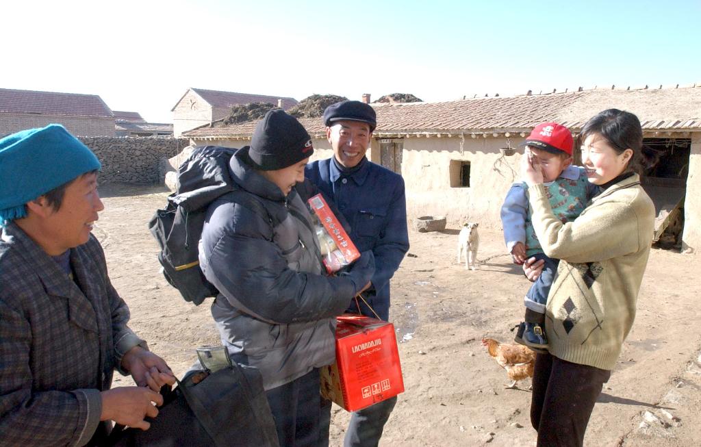 2002年2月10日,外出打工的褚明東(左二)在臘月二十九回到家鄉河北省張北縣米家溝村,父母、妻女早早地等在家門口。新華社記者 周文廣 攝