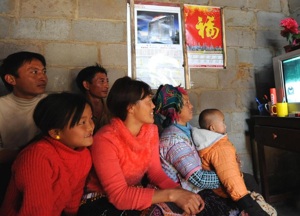 2012年1月31日,回家過年的陶正明(后排左一)、楊國玉(前排左二)與家人一起收看電視節目。在安徽打工的陶正明、楊國玉夫婦回到云南省開遠市樂百道辦事處核桃寨村的家中,與跟隨爺爺奶奶留守的獨生女兒團聚,讓這個苗族農家小院洋溢著濃濃的親情和節日的歡樂。新華社記者 陳海寧 攝