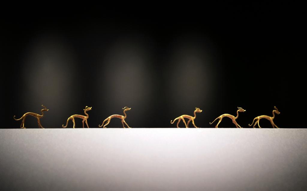 這是在陜西歷史博物館“大唐遺寶——何家村窖藏出土文物展”上拍攝的赤金走龍(2022年5月18日攝)。新華社記者 李一博 攝
