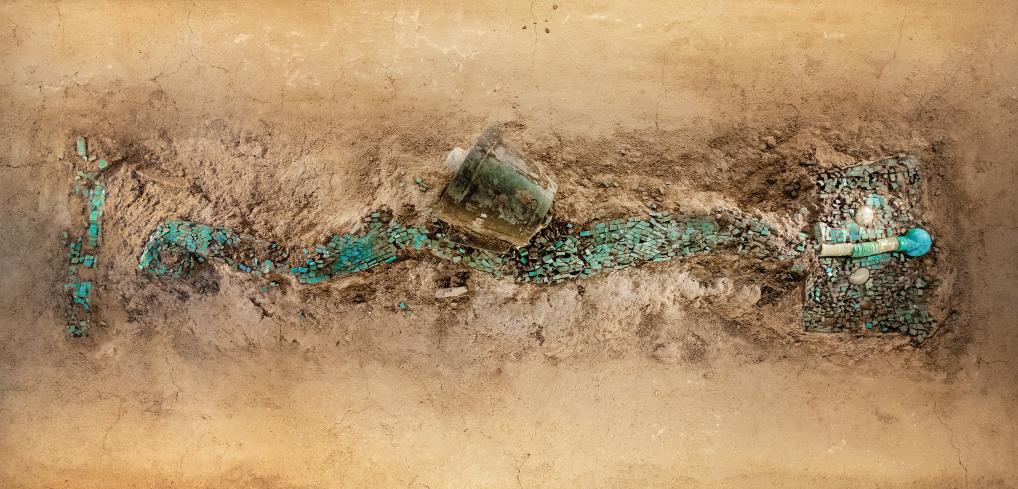 為更好保護文物,博物館里我們只能看到綠松石龍形器的上半部分,下半部分仍埋在土里,保持著三千多年來的狀態,“考古味兒”十足。