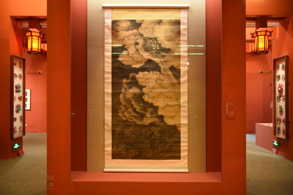 中國國家博物館藏南天祥絹本指畫墨龍軸,繪一龍隱于云海之中,張口吐水,氣勢磅礴,藝術表現出人們心中的龍形象;