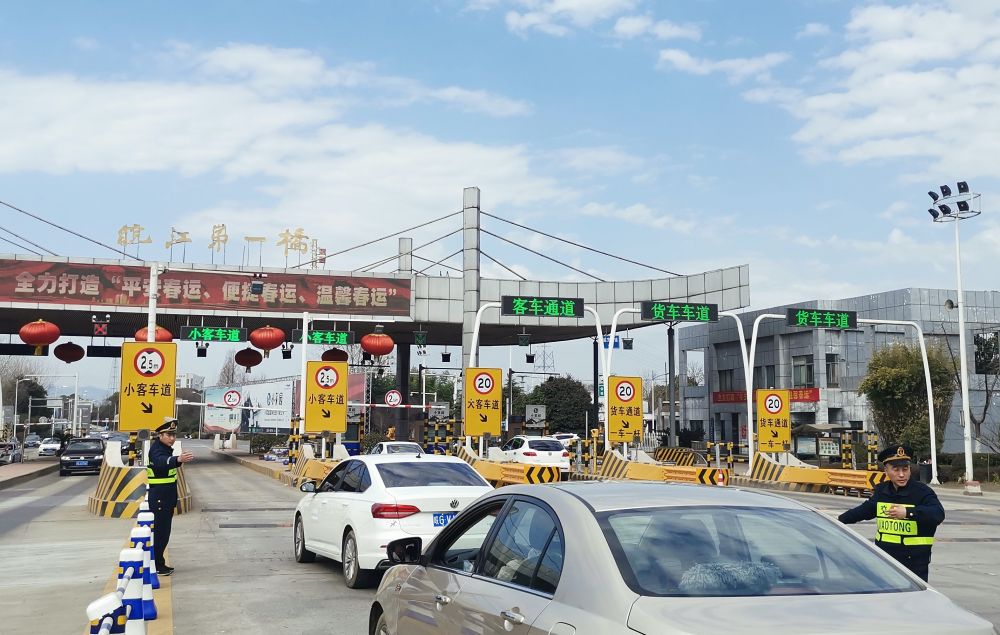 2月13日,安徽銅陵長江公路大橋管理處工作人員指揮引導車輛安全有序通行。新華社發(陶濤 攝)