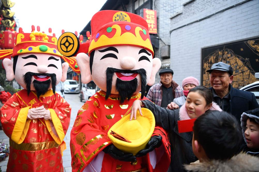 2019年2月9日是農歷正月初五,在安徽省亳州南京巷錢莊景區,“財神”向游客發紅包、送祝福。