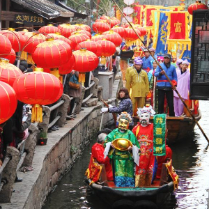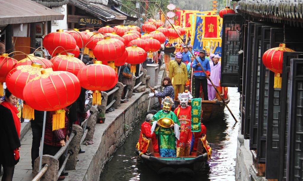2015年2月23日是農歷正月初五,“財神”在蘇州水鄉周莊古鎮乘船巡游,為中外游客送福。