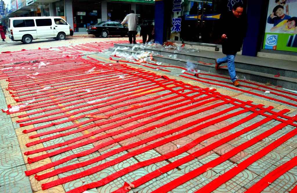 2004年1月26日大年初五,蘇州一家商鋪前爆竹鋪滿地面,以求開門大吉。