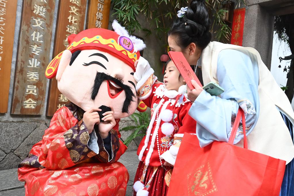 2023年1月26日是農歷正月初五,在福建福州市三坊七巷,民俗巡游隊伍中的“財神”和小朋友互動。