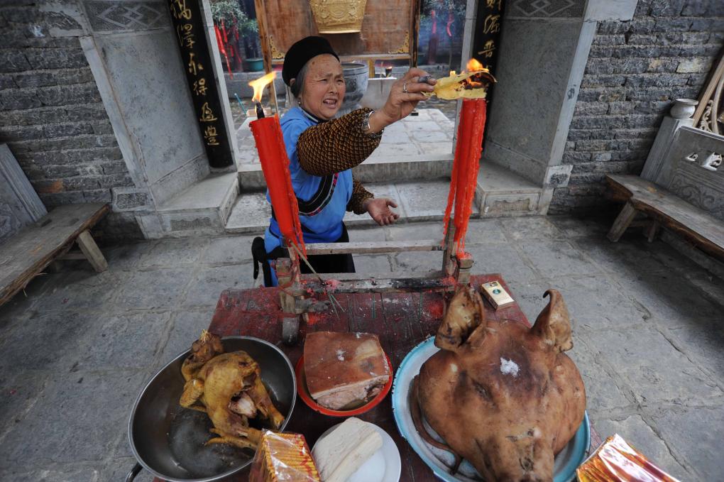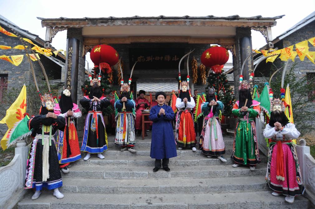 2011年2月7日是農歷正月初五,貴州省平壩區天龍屯堡古鎮舉行迎財神等民俗活動。這是演員在表演祭祀場景。