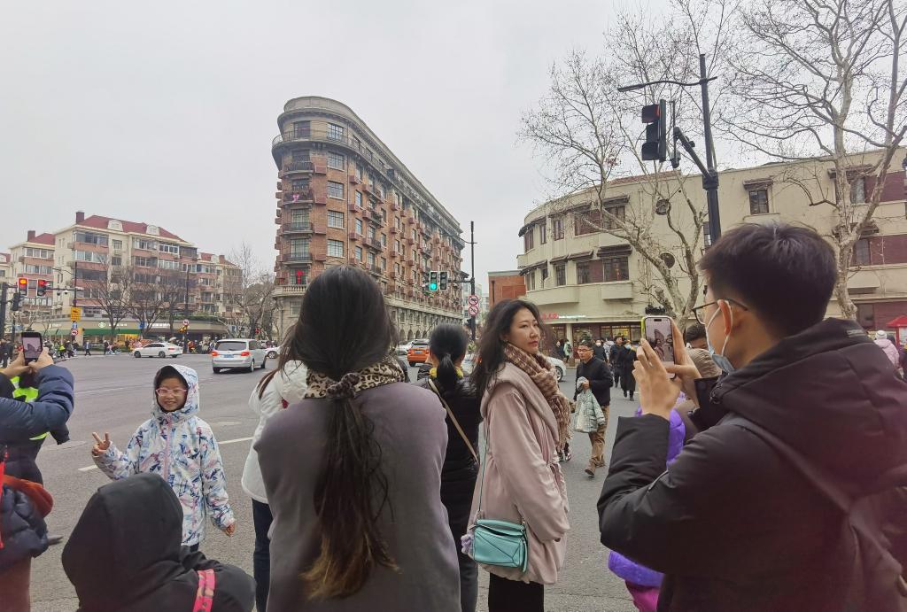 2月15日,游客紛紛與造型獨特、形如“巨輪”的上海武康大樓合影。新華社記者陳愛平 攝