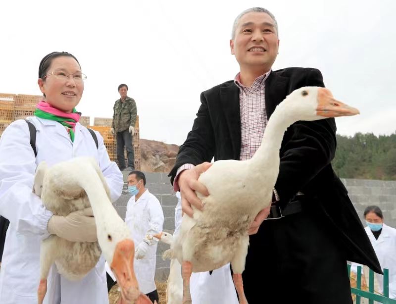 2020年3月25日,張新建(右)展示村里養殖的大白鵝。新華社發
