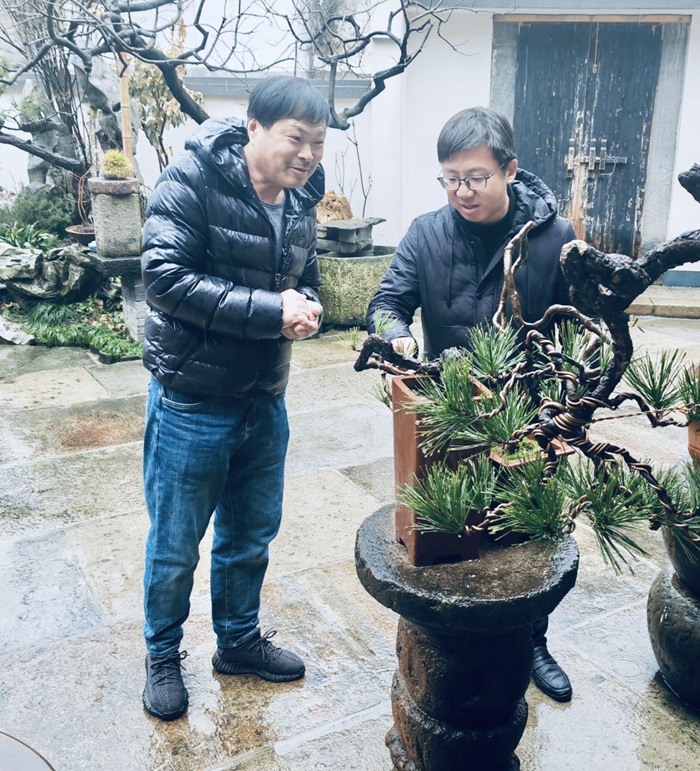 2024年2月1日,彭鋮(右)在農戶家中了解盆景管護情況。新華社記者 王俊祿 攝