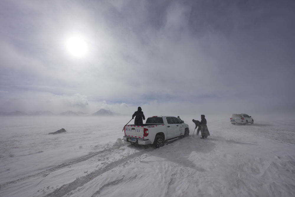 瑪曲鄉長江源黨員環保志愿隊巡邏途中車輛陷入雪中后進行自救(2024年2月2日攝)。新華社記者 晉美多吉 攝