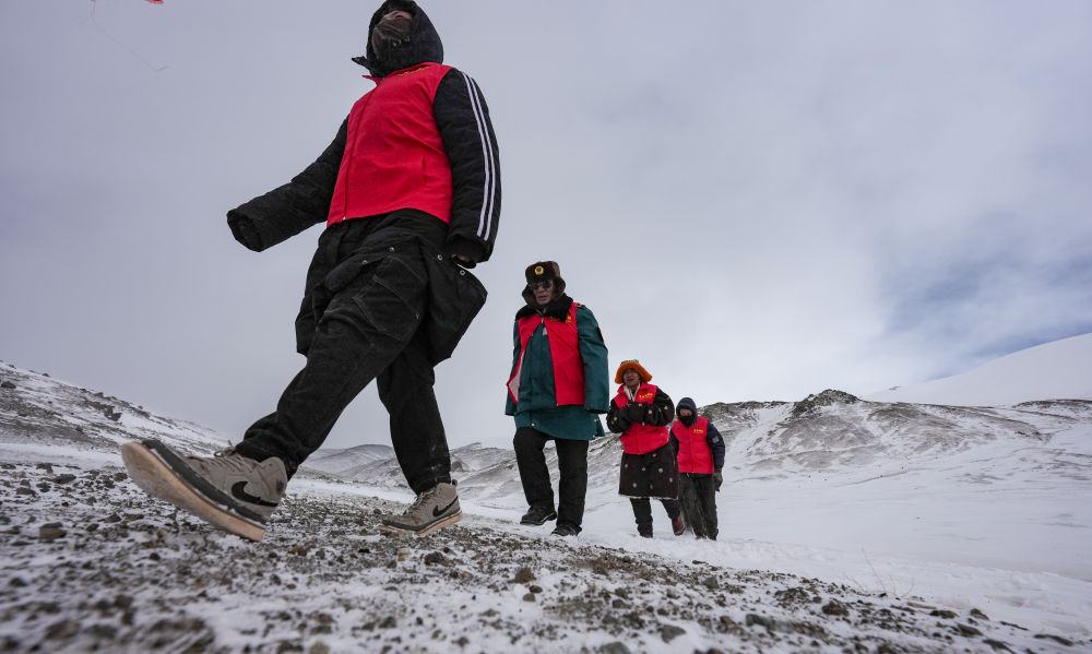 瑪曲鄉長江源黨員環保志愿隊年近七旬的才嘎老人(左二)在巡邏守護長江源(2024年2月2日攝)。新華社記者 晉美多吉 攝
