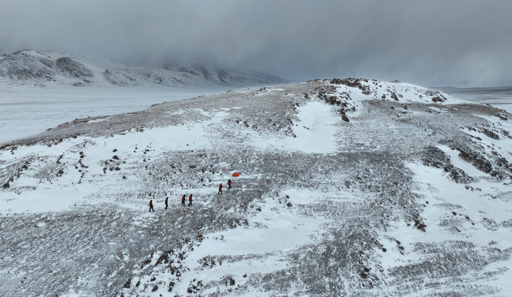 瑪曲鄉長江源黨員環保志愿隊在巡邏守護長江源(2024年2月2日攝,無人機照片)。新華社記者 晉美多吉 攝