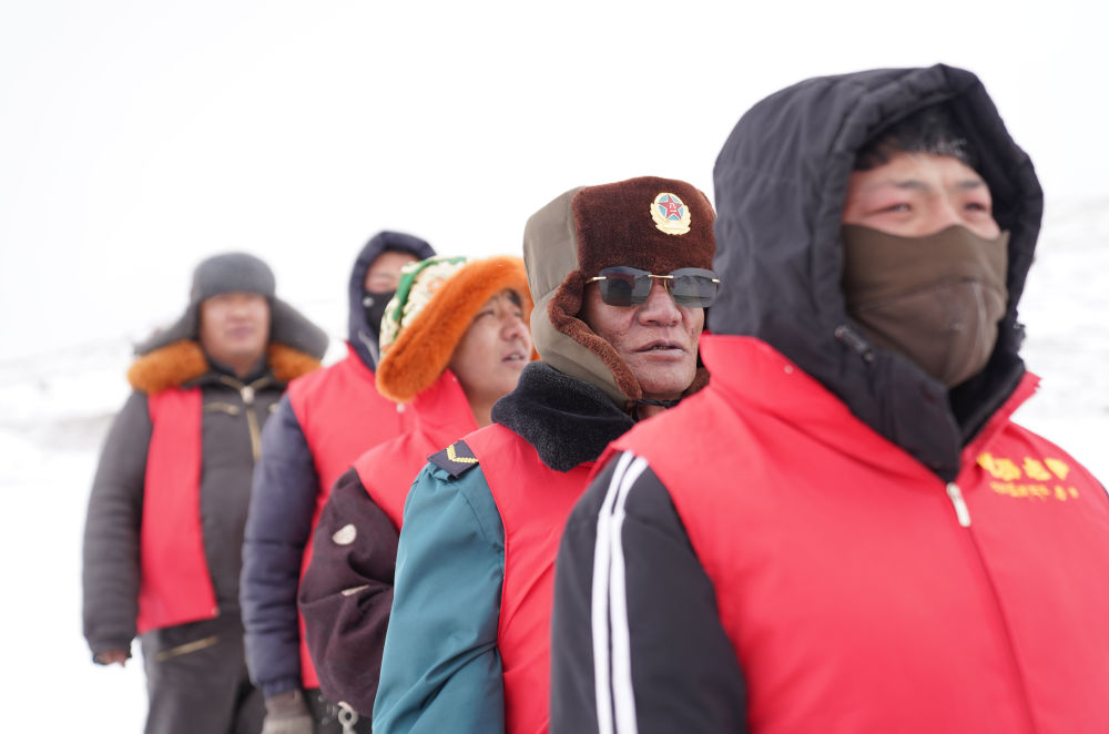 瑪曲鄉長江源黨員環保志愿隊年近七旬的才嘎老人(右二)在巡邏守護長江源(2024年2月2日攝)。新華社記者 晉美多吉 攝