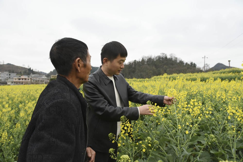 初春,遵義市播州區茅栗鎮花果村油菜花開,一抹陽光灑下,田野中金黃燦燦。村民鐘時福與從貴陽趕來的“揭榜掛帥”專家凡迪站在田埂上,仔細觀察油菜長勢。