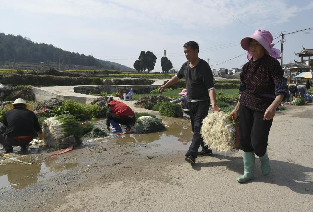 2024年2月21日,貴陽市花溪區黔陶鄉農戶搬運剛采收的香蔥。新華社記者 胡星 攝
