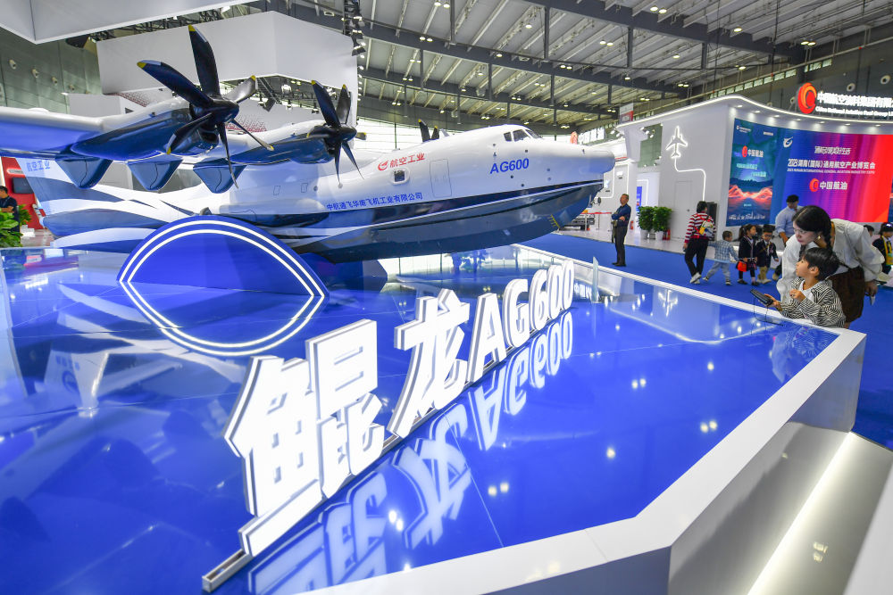在湖南長沙國際會展中心舉辦的2023湖南(國際)通用航空產業博覽會上,參觀者在中國航空工業集團有限公司展位參觀“鯤龍”AG600模型(2023年9月22日攝)。新華社記者 陳澤國 攝
