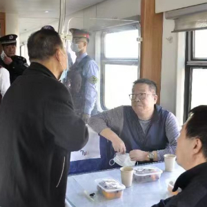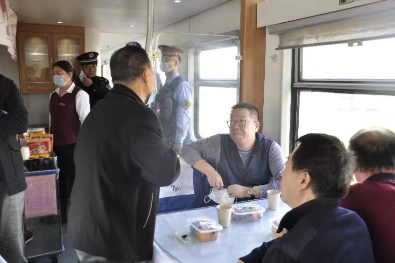 高滿堂(座位居中者)在列車上同乘務人員交談。受訪者供圖
