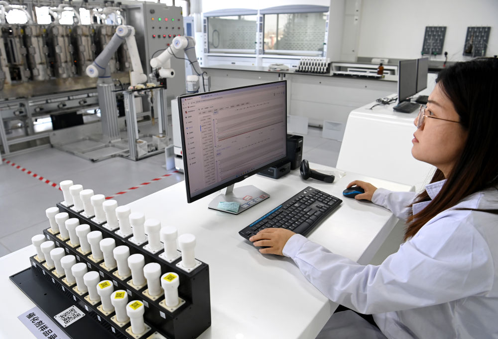 2024年2月28日,工作人員黨小梅在陜西榆林中科潔凈能源創新研究院基于人工智能的高通量催化反應研究平臺實驗室進行實驗。新華社記者 鄒競一 攝