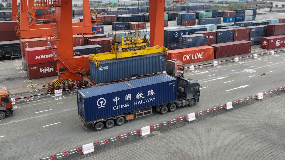 2024年3月1日,在天津港北疆港區C段智能化集裝箱碼頭,起重機搬運集裝箱。新華社記者 單宇琦 攝
