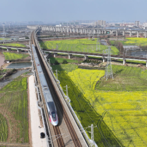 2024年3月2日,一輛高鐵列車從江西省南昌市南昌縣一處油菜花田旁駛過(無人機照片)。新華社記者 金良快 攝