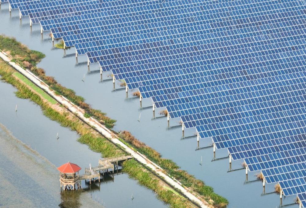 2023年10月11日拍攝的江蘇省興化市千垛鎮連片的光伏發電板(無人機照片)。新華社發(周社根 攝)