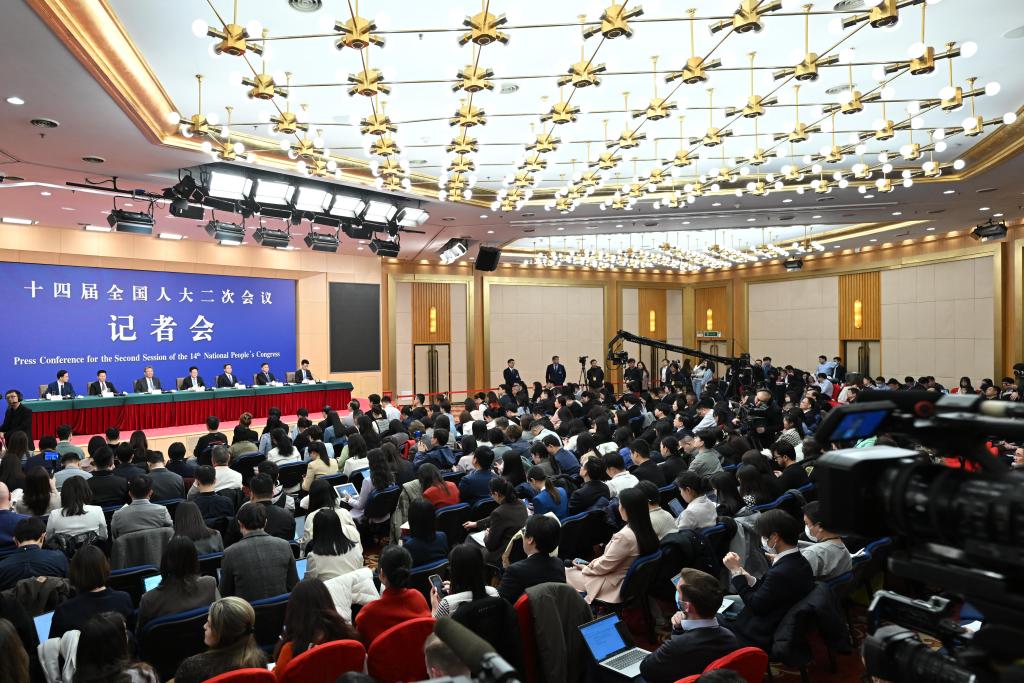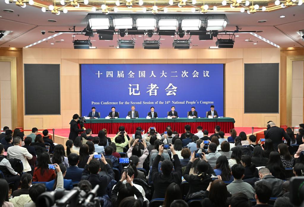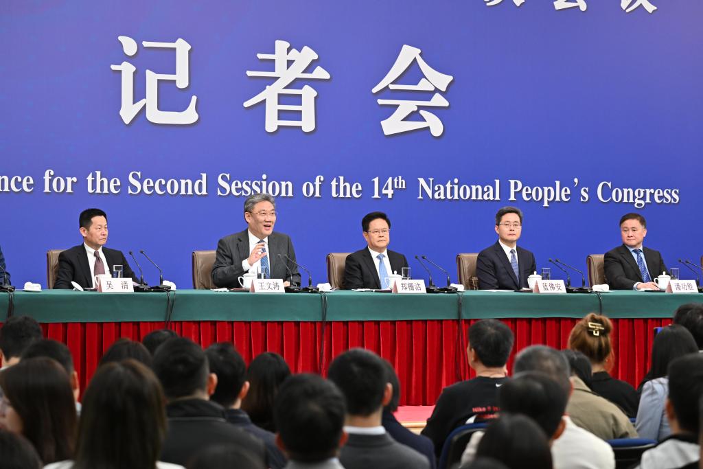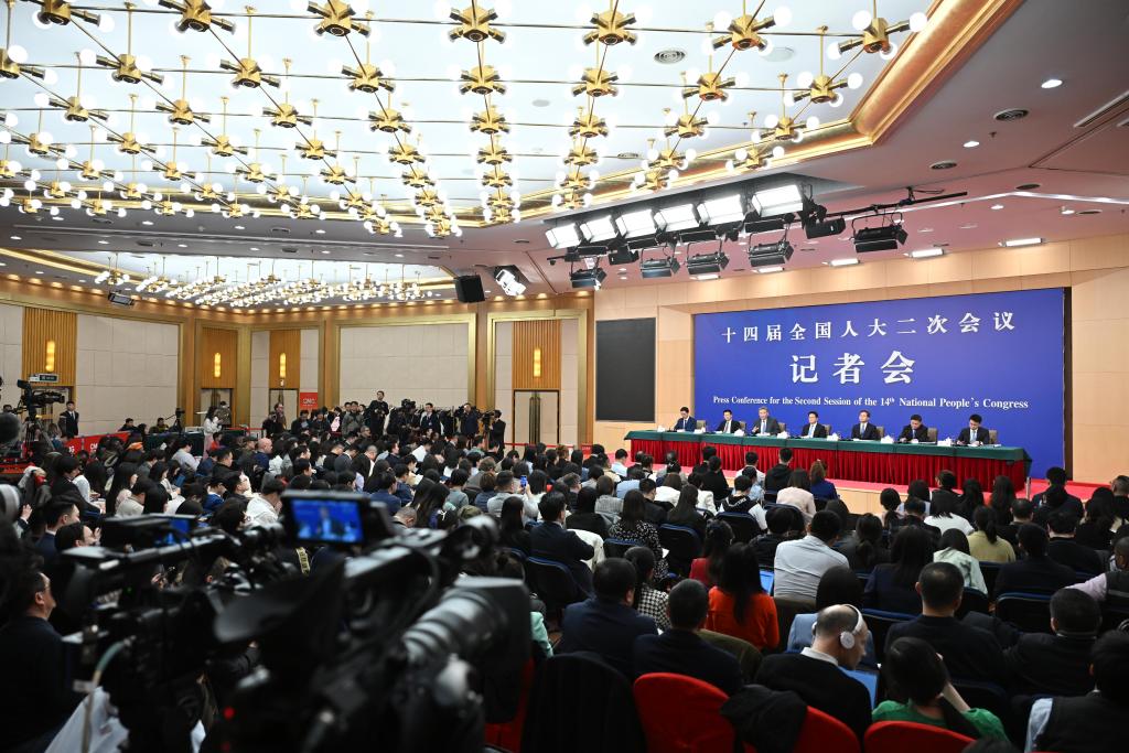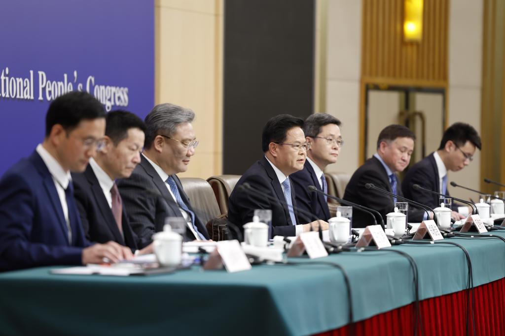 3月6日,十四屆全國人大二次會議在北京梅地亞中心新聞發布廳舉行記者會。國家發展和改革委員會主任鄭柵潔、財政部部長藍佛安、商務部部長王文濤、中國人民銀行行長潘功勝、中國證券監督管理委員會主席吳清就發展改革、財政預算、商務、金融證券等相關問題回答中外記者提問。