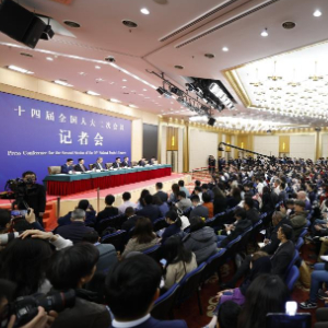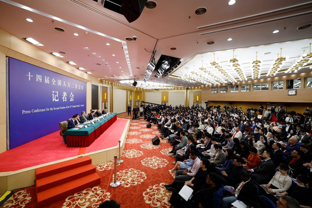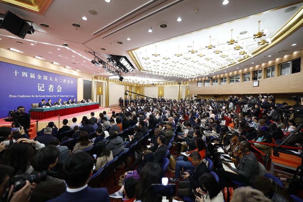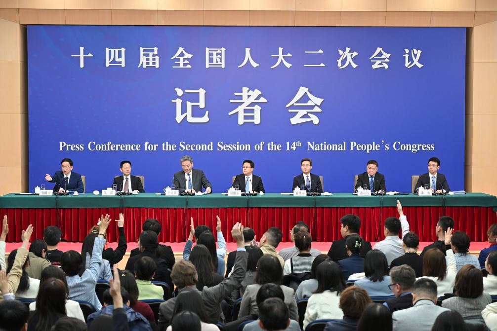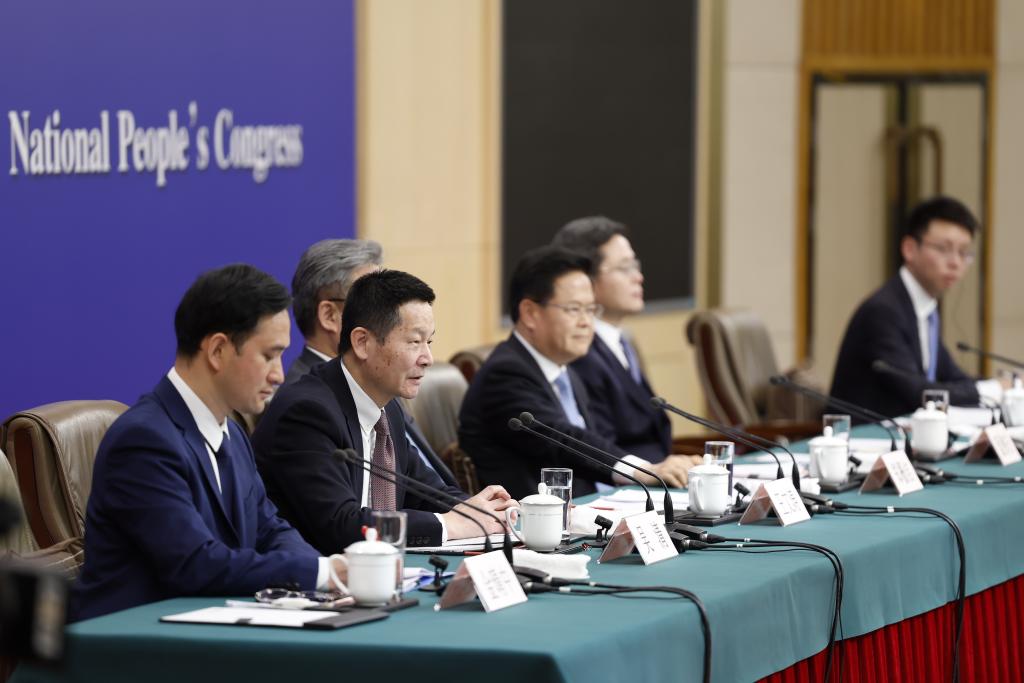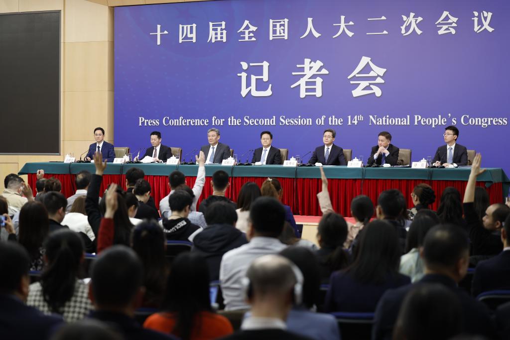 3月6日,十四屆全國人大二次會議在北京梅地亞中心新聞發布廳舉行記者會。國家發展和改革委員會主任鄭柵潔、財政部部長藍佛安、商務部部長王文濤、中國人民銀行行長潘功勝、中國證券監督管理委員會主席吳清就發展改革、財政預算、商務、金融證券等相關問題回答中外記者提問。