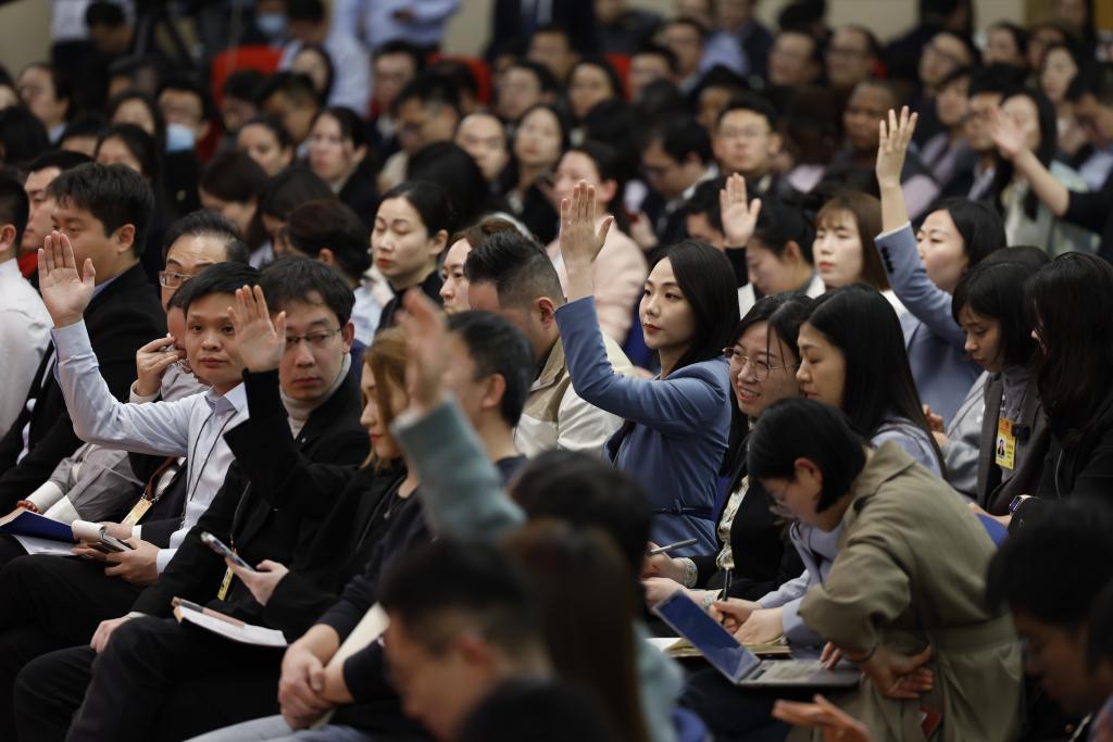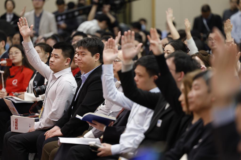 3月6日,十四屆全國人大二次會議在北京梅地亞中心新聞發布廳舉行記者會。國家發展和改革委員會主任鄭柵潔、財政部部長藍佛安、商務部部長王文濤、中國人民銀行行長潘功勝、中國證券監督管理委員會主席吳清就發展改革、財政預算、商務、金融證券等相關問題回答中外記者提問。這是記者舉手提問。