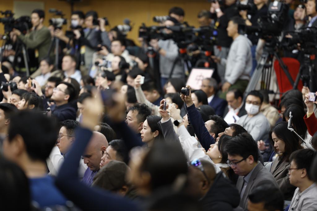 3月6日,十四屆全國人大二次會議在北京梅地亞中心新聞發布廳舉行記者會。國家發展和改革委員會主任鄭柵潔、財政部部長藍佛安、商務部部長王文濤、中國人民銀行行長潘功勝、中國證券監督管理委員會主席吳清就發展改革、財政預算、商務、金融證券等相關問題回答中外記者提問。這是記者在現場采訪。