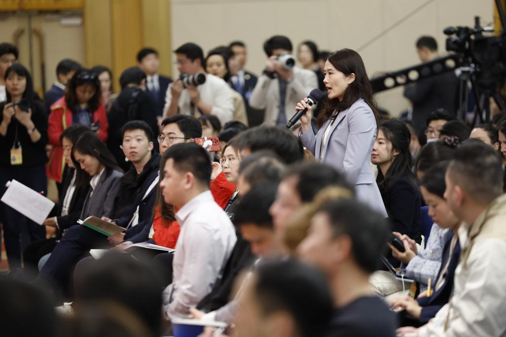 3月6日,十四屆全國人大二次會議在北京梅地亞中心新聞發布廳舉行記者會。國家發展和改革委員會主任鄭柵潔、財政部部長藍佛安、商務部部長王文濤、中國人民銀行行長潘功勝、中國證券監督管理委員會主席吳清就發展改革、財政預算、商務、金融證券等相關問題回答中外記者提問。這是新華社記者在提問。