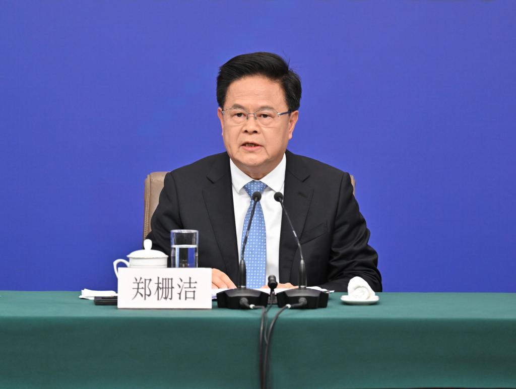 3月6日,十四屆全國人大二次會議在北京梅地亞中心新聞發布廳舉行記者會。國家發展和改革委員會主任鄭柵潔、財政部部長藍佛安、商務部部長王文濤、中國人民銀行行長潘功勝、中國證券監督管理委員會主席吳清就發展改革、財政預算、商務、金融證券等相關問題回答中外記者提問。這是鄭柵潔在回答記者提問。