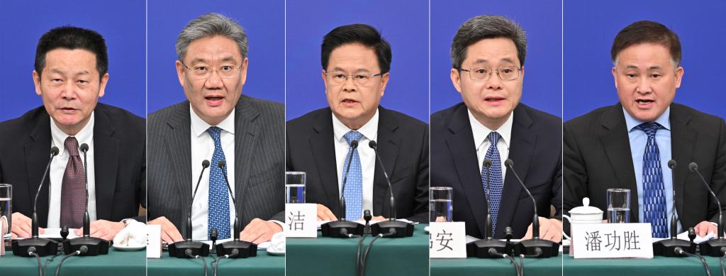 3月6日,十四屆全國人大二次會議在北京梅地亞中心新聞發布廳舉行記者會。國家發展和改革委員會主任鄭柵潔(中)、財政部部長藍佛安(右二)、商務部部長王文濤(左二)、中國人民銀行行長潘功勝(右一)、中國證券監督管理委員會主席吳清(左一)就發展改革、財政預算、商務、金融證券等相關問題回答中外記者提問(拼版照片)。