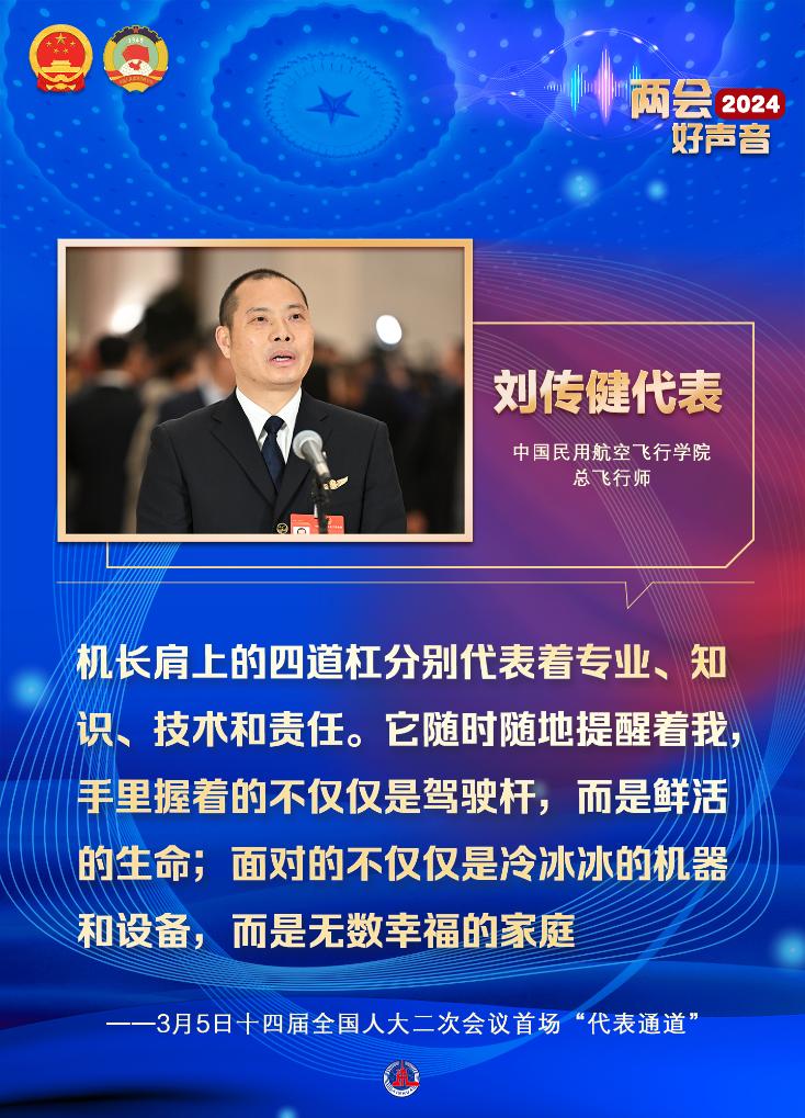 劉傳健說:“機長肩上的四道杠分別代表著專業、知識、技術和責任。它隨時隨地提醒著我,手里握著的不僅僅是駕駛桿,而是鮮活的生命;面對的不僅僅是冷冰冰的機器和設備,而是無數幸福的家庭?!?/p>