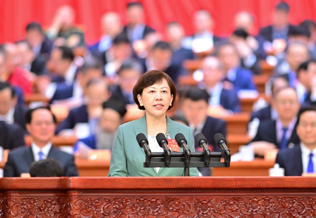 3月7日,全國政協十四屆二次會議在北京人民大會堂舉行第二次全體會議。這是司馬紅委員代表民建中央作大會發言。新華社記者 翟健嵐 攝