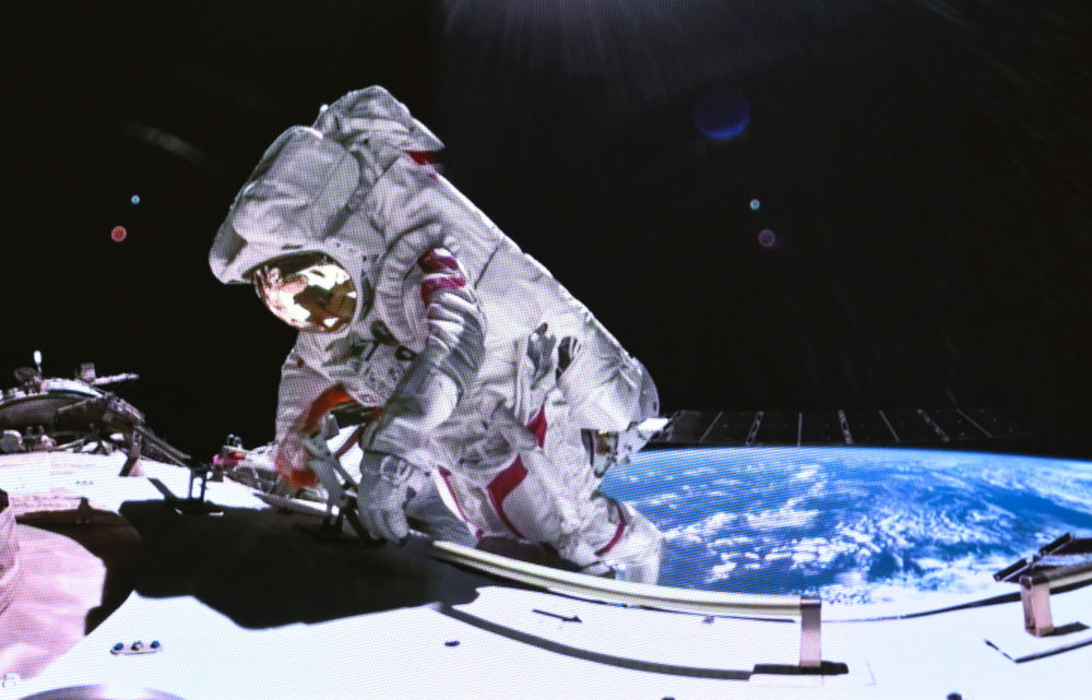 這是2024年3月2日在北京航天飛行控制中心拍攝的神舟十七號航天員湯洪波在空間站組合體艙外作業的畫面。