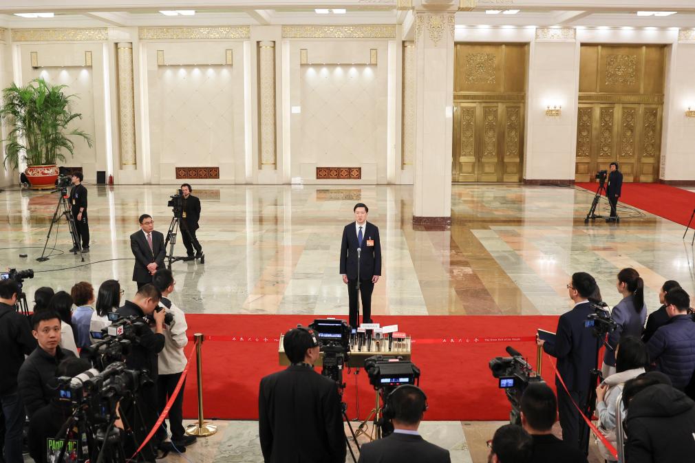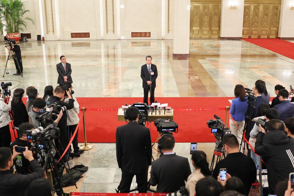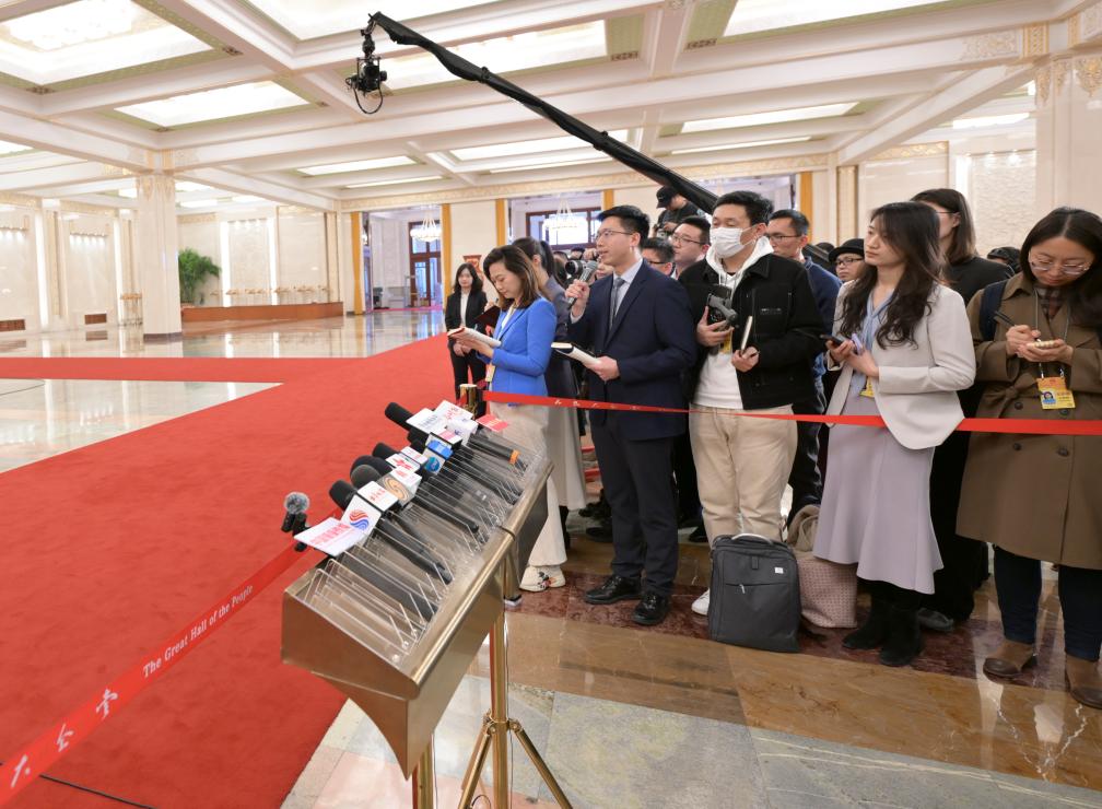 3月11日,第十四屆全國人民代表大會第二次會議第三場“部長通道”集中采訪活動在北京人民大會堂舉行。這是記者在現場采訪拍攝。