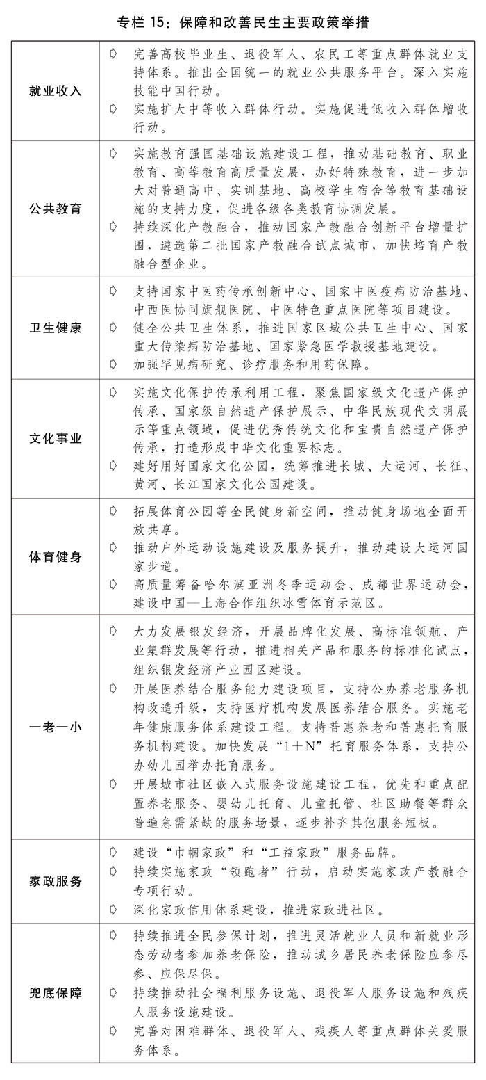 四是促進社會事業繁榮發展。推動義務教育優質均衡發展和城鄉一體化,改善農村寄宿制學校辦學條件,提高職業教育質量,建設中國特色、世界一流的大學和優勢學科,實施高等教育綜合改革試點,研究優質高等教育資源擴容、優化學科專業和區域布局,增強中西部和東北地區高校辦學實力。推進教育高水平對外開放。加強精神文明建設,大力發展社會主義先進文化,推動中華優秀傳統文化創造性轉化、創新性發展。加強文化遺產保護傳承利用,推動文化事業和文化產業繁榮發展。加強文化遺產普查認定,開展第四次全國文物普查,建設國家文化遺產資源大數據庫。加強歷史文化名城、街區、村鎮等整體保護和活態傳承。推進中華文明探源。保護傳承弘揚好長江、黃河文化。建好用好國家文化公園。推動實施重大文化產業項目帶動戰略,進一步完善相關政策。創新實施文化惠民工程,加強重大公共文化和旅游設施建設,推動文化和旅游深度融合和高質量發展。發展哲學社會科學、新聞出版、廣播影視、文學藝術和檔案等事業。持續推進全民健身工作,推動體育公園和國家步道體系建設,打造戶外運動高質量目的地,加強社會足球場建設利用,普及群眾性公益性賽事活動。推動城市社區嵌入式服務設施建設工程落地生效,讓群眾在家門口享受到優質普惠社區服務。全面加強兒童友好城市建設。開展家政服務質量提升十大行動,深化家政服務產教融合。加強社會服務設施建設,強化對殘疾人等重點群體的關愛與服務。